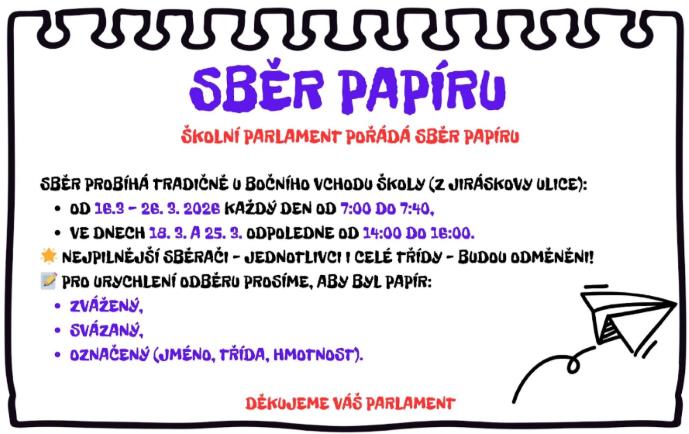 | 16.3.-26.3. | Sběr starého papíru, soutěž tříd do 26. 3. |